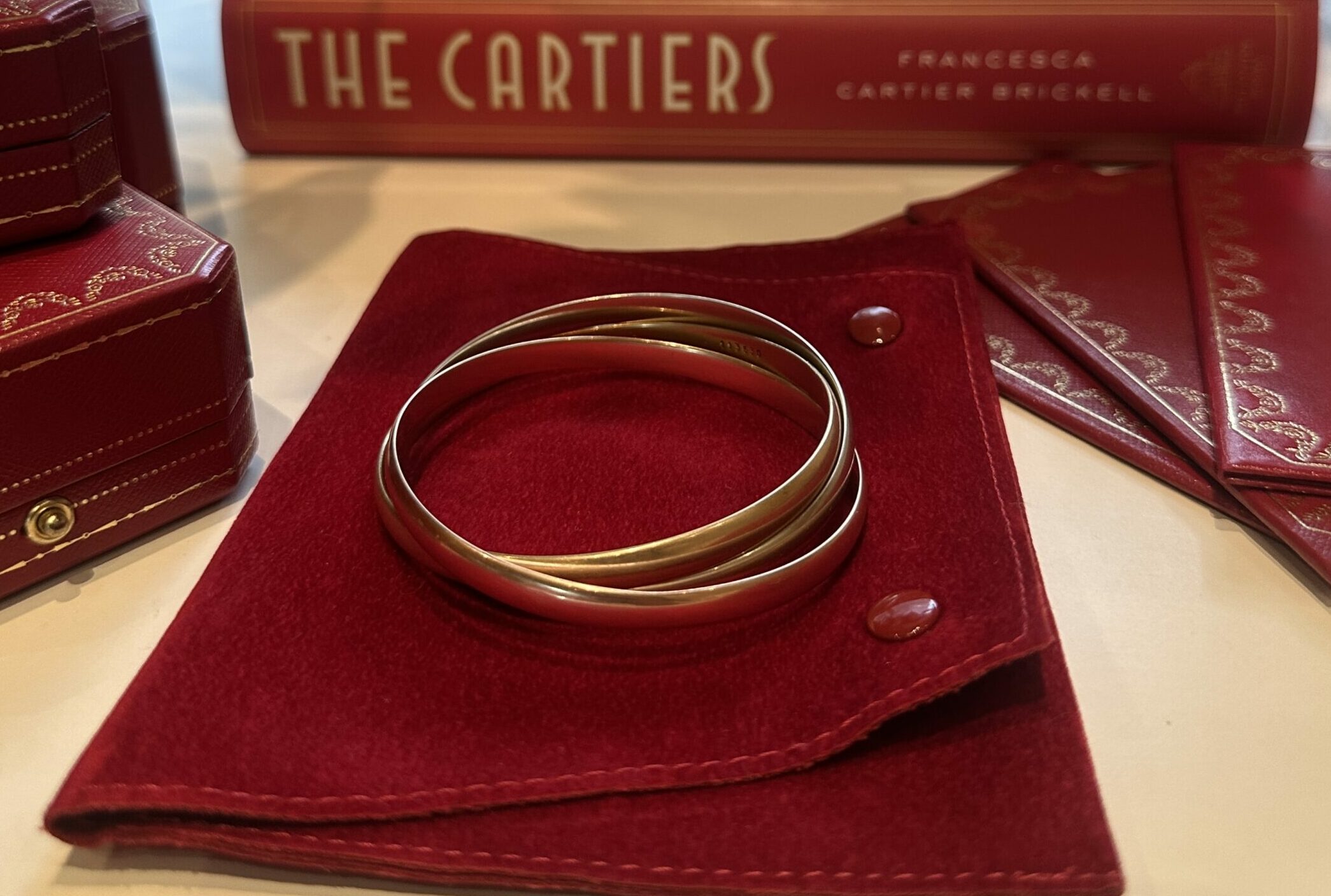 Lot 86 : CARTIER – Bracelet en trois tons d’or 18K (750), modèle Trinity. Signé et numéroté. Conservé dans sa pochette. Diamètre : 6 cm environ. Largeur : 0,5 cm. Poids : 73,5 g