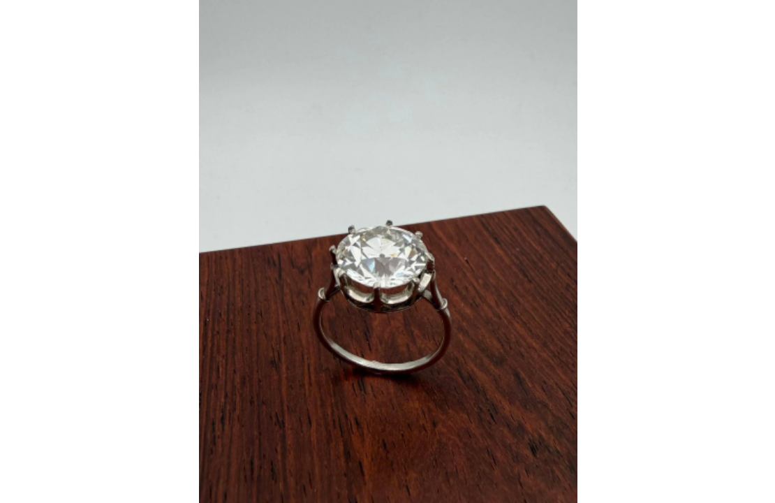 Lot 20 : Bague en platine, ornée d’un diamant rond de taille ancienne pesant 5,33 cts. Tour de doigt : 51. Dimensions diamant : 11,06 – 11,25 x 7,05 mm. Poids brut : 4,5 g (égrisures) Le diamant accompagné d’un pré-rapport LFG (2026) attestant : couleur I, pureté SI1, fluorescence faible