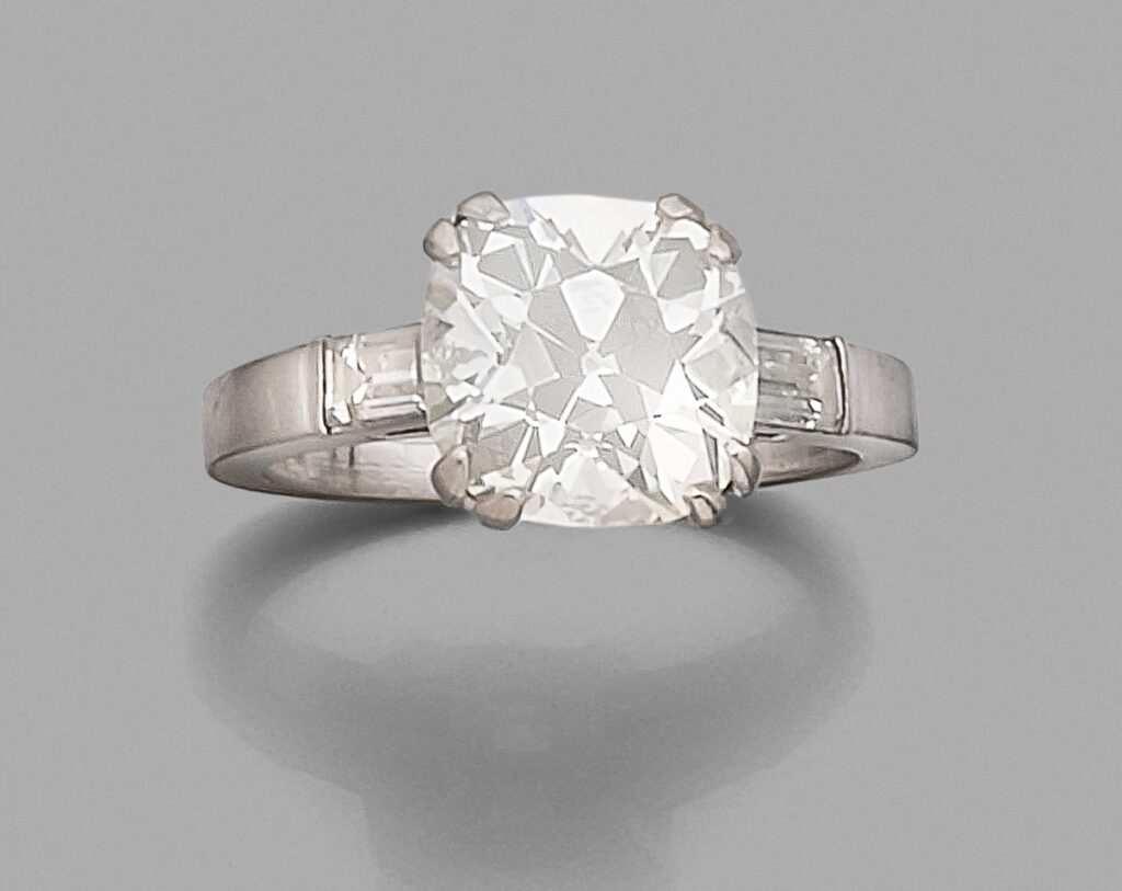 Lot 188 : Bague en platine, ornée d’un diamant coussin de taille ancienne pesant 3,52 cts, épaulée de diamants baguettes. Tour de doigt : 53/54. Dimensions diamant : 9,3 x 9,4 x 6 mm environ. Poids brut : 5,3 g