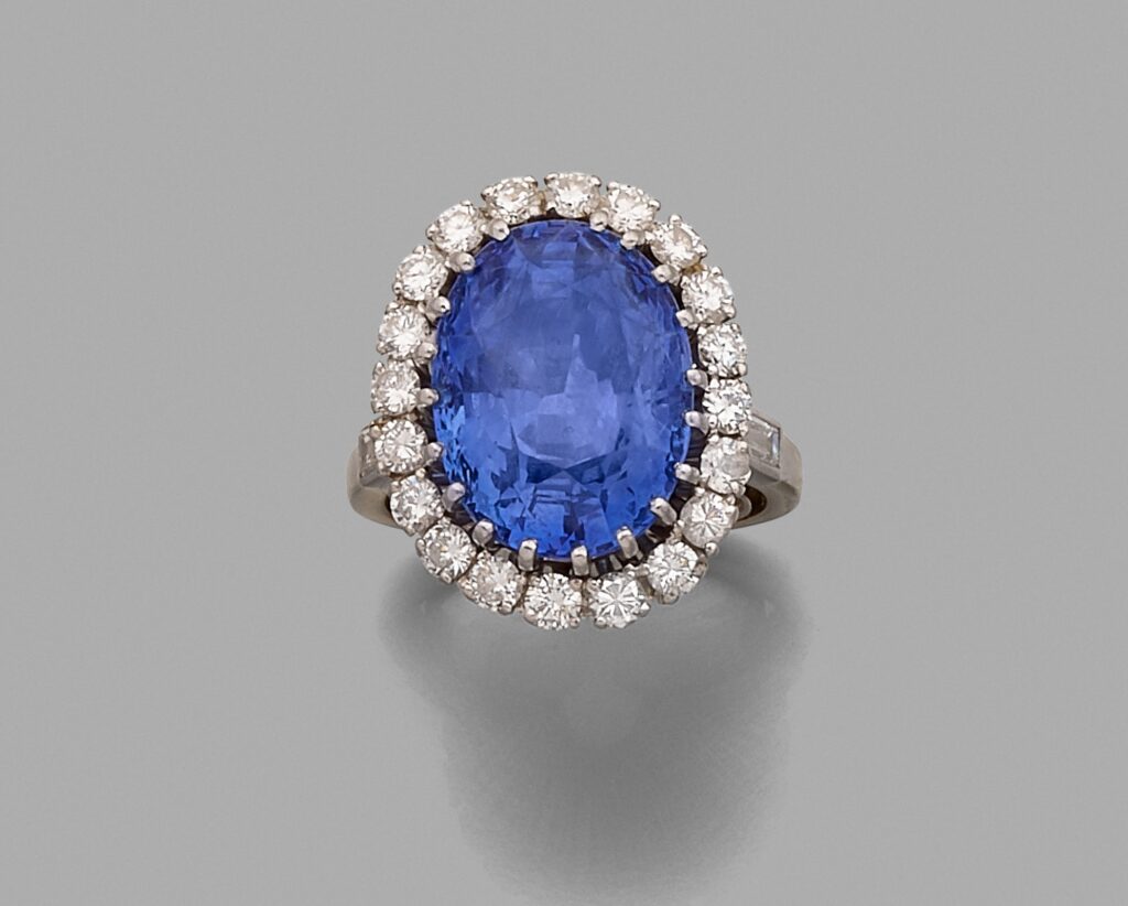 Lot 193 : Bague en or gris 18K (750) et en platine, ornée d’un saphir de forme ovale entouré de diamants ronds de taille brillant, épaulé de diamants baguettes. Tour de doigt : 52. Dimensions saphir : 16,0 x 12,1 x 10,1 mm. Poids brut : 15,9g. Le saphir accompagné d’un rapport GEM-Paris (2025) attestant : origine Sri Lanka, pas de modification ou traitement observés.