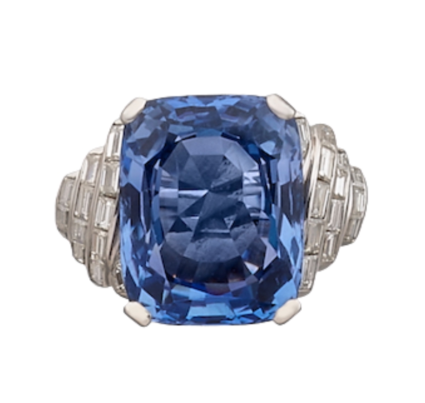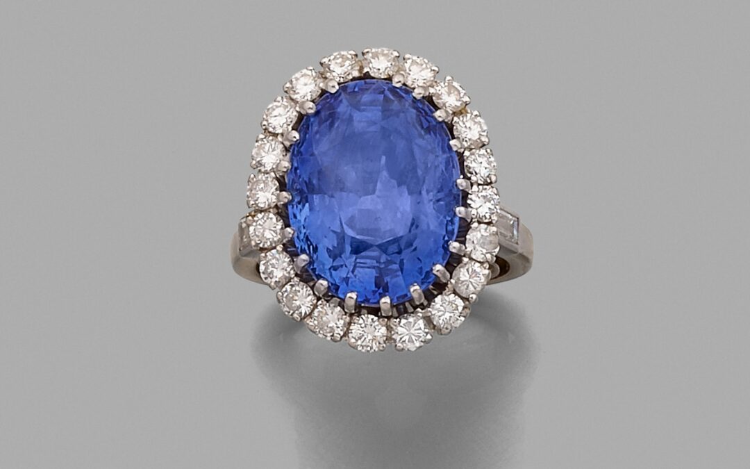 Lot 192 : Bague en platine, ornée d’un saphir de forme coussin pesant 16,6 cts épaulé de lignes ondulées serties de diamants calibrés. Travail français des années 1950. Tour de doigt : 55. Dimensions saphir : 16,1 x 12,8 x 7,0 mm. Poids brut : 10,3 g (micro-choc). Le saphir accompagné d’un rapport GEM-Paris (2025) attestant : Origine Sri Lanka, pas de modification ou traitement observés.