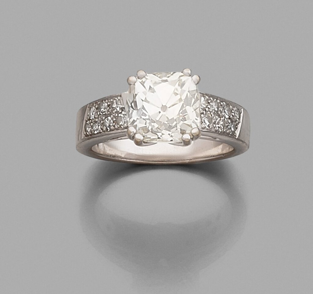 Lot 190 : Bague en or gris 18K (750), ornée d’un diamant coussin de taille ancienne pesant 4,25 cts épaulé de 2 lignes de diamants 8/8. Tour de doigt : 56. Dimensions diamant : 9 x 9 mm environ. Poids brut : 10,7 g (chocs avec manques de matière)