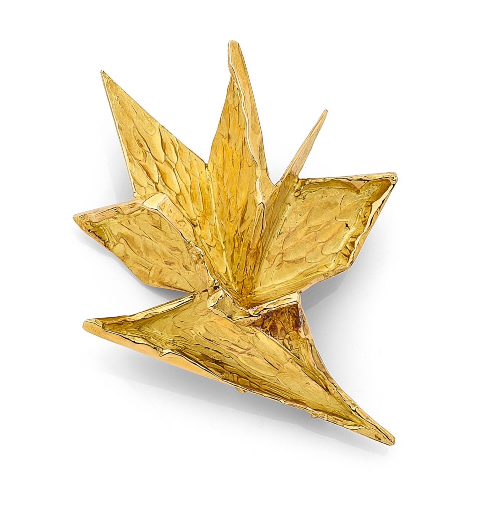 Lot 195 : CHAUMET – Broche-clip en or 18K (750) ciselé formant un motif abstrait plié. Signé. Travail français des années 1970. Conservé dans un écrin en suédine sable. Hauteur : 8 cm environ. Poids : 41,3 g