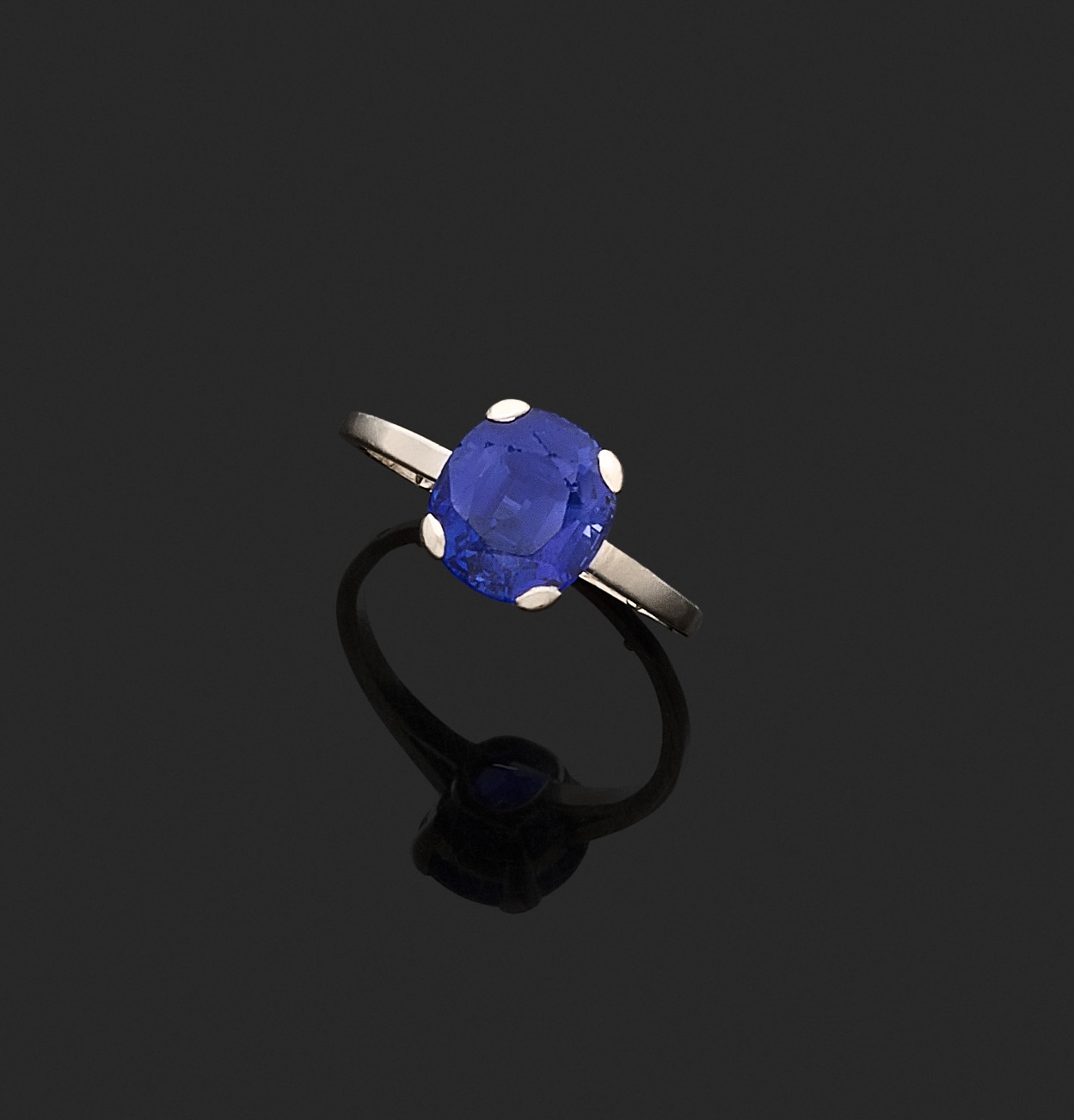 Lot 183 : Bague en platine, ornée d’un saphir de forme coussin. Tour de doigt : 58. Dimensions saphir : 10,3 x 9,4 x 6,1 mm. Poids brut : 4,5 g Le saphir accompagné d’un rapport GEM-Paris (2025) attestant : origine Sri Lanka, pas de modification ou traitement observé