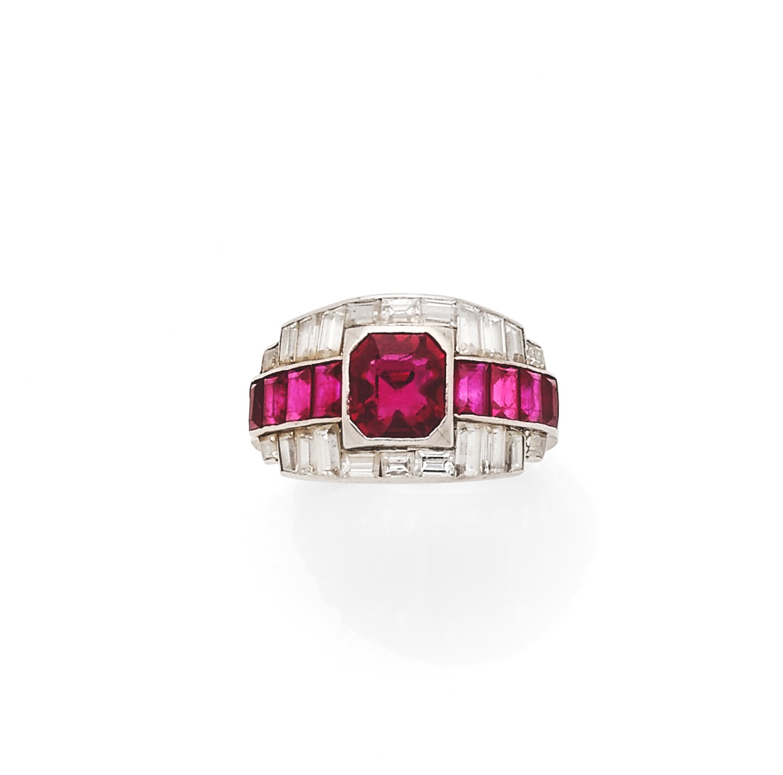 Lot 109 : Bague en platine, ornée d’un rubis octogonal épaulé de rubis calibrés, entre deux lignes de diamants calibrés. Travail français des années 1925. Tour de doigt : 50. Dimensions rubis : 6,2 x 5,8 x 4,2 mm environ. Poids brut : 4,3 g (chocs) Le rubis accompagné d’un pré-rapport GEM-Paris (2026) attestant : origine Myanmar, non chauffé