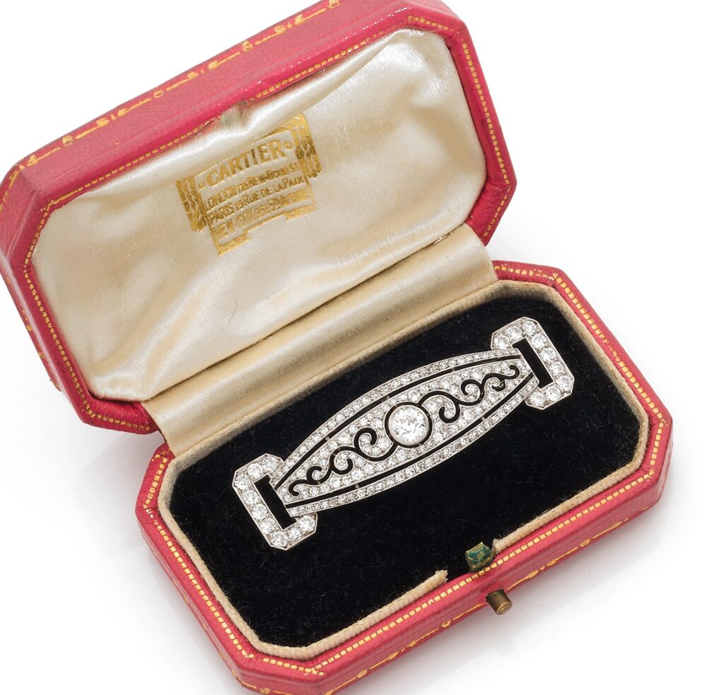 Lot 95 : CARTIERBroche en platine repercé d’arcatures, sertie d’un diamant rond de taille ancienne, soulignée de diamants de taille ancienne plus petits. Signée et numérotée. Conservée dans son écrin. Dimensions : 4,8 x 1,2 cm environ. Poids brut : 7,1 g