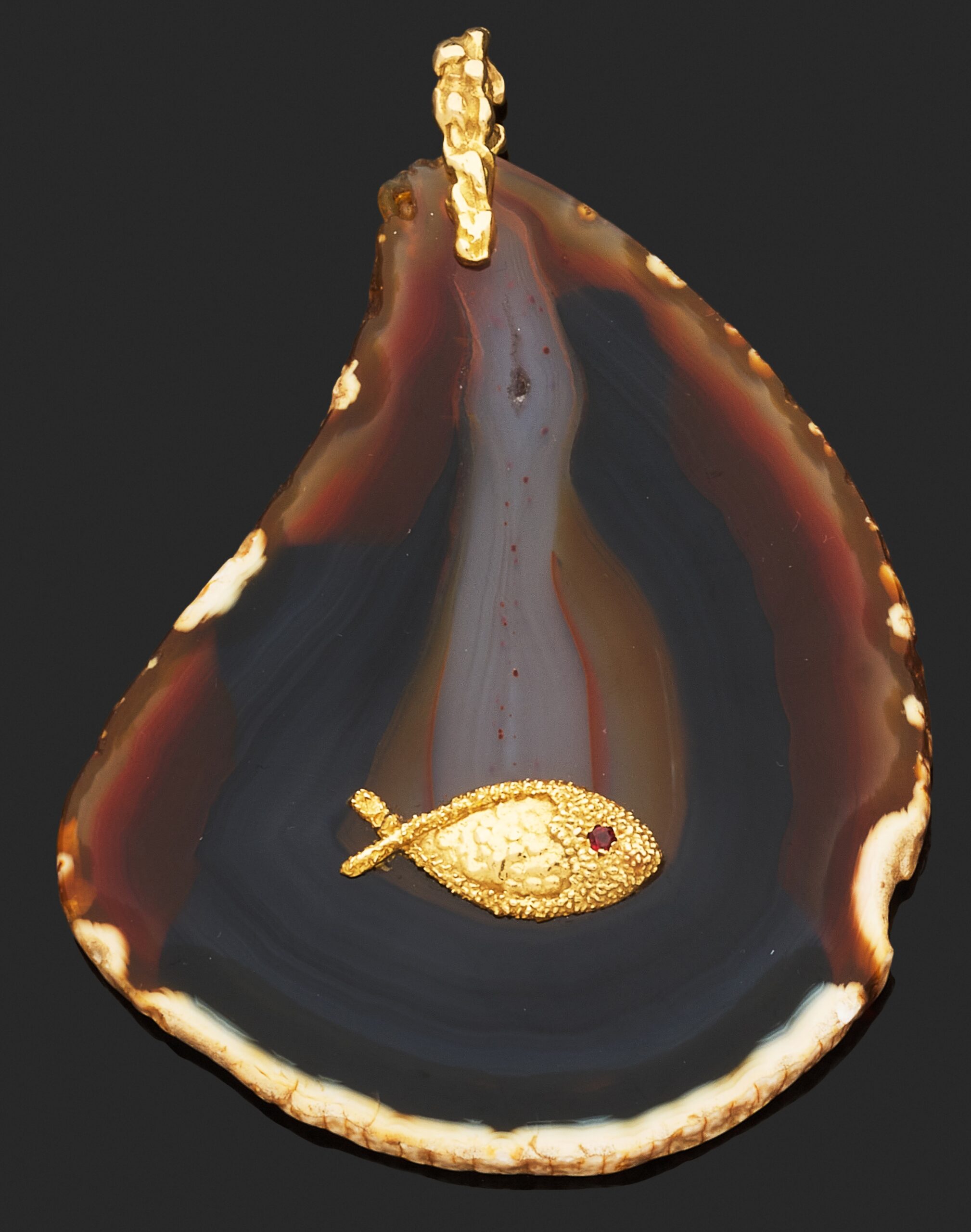 Lot 16 : Grand pendentif en agate appliquée d’un poisson en or 18K (750‰), l’œil agrémenté d’un rubis, la bélière en or texturé 18K. Signé Bijoux de Braque GAEA Heger de Lowenfeld, numéroté LP2869. Accompagné de son attestation de réalisation. Hauteur : environ 7 cm – Poids brut : 33,8 g