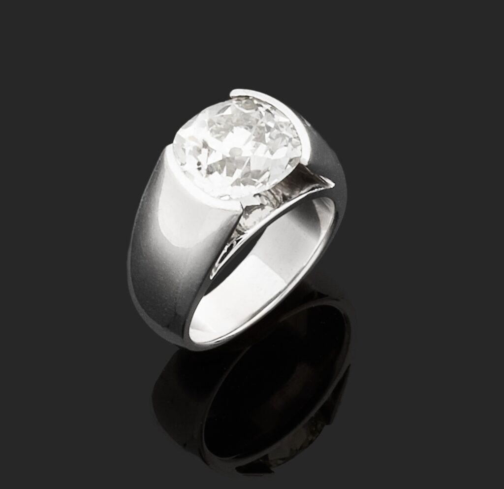 Lot 20 : Bague en or gris 18K (750‰), ornée d’un diamant coussin de taille ancienne. Tour de doigt : 56. Dimensions diamant : environ 11,2 / 10,2 mm (profondeur inaccessible) Poids brut : 22 g