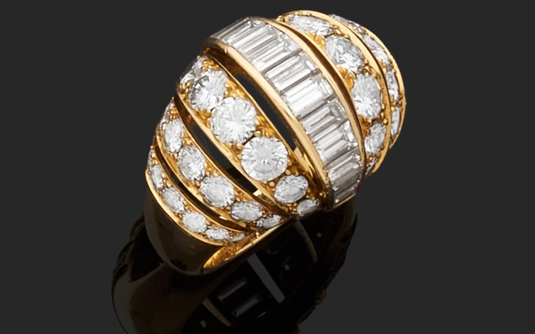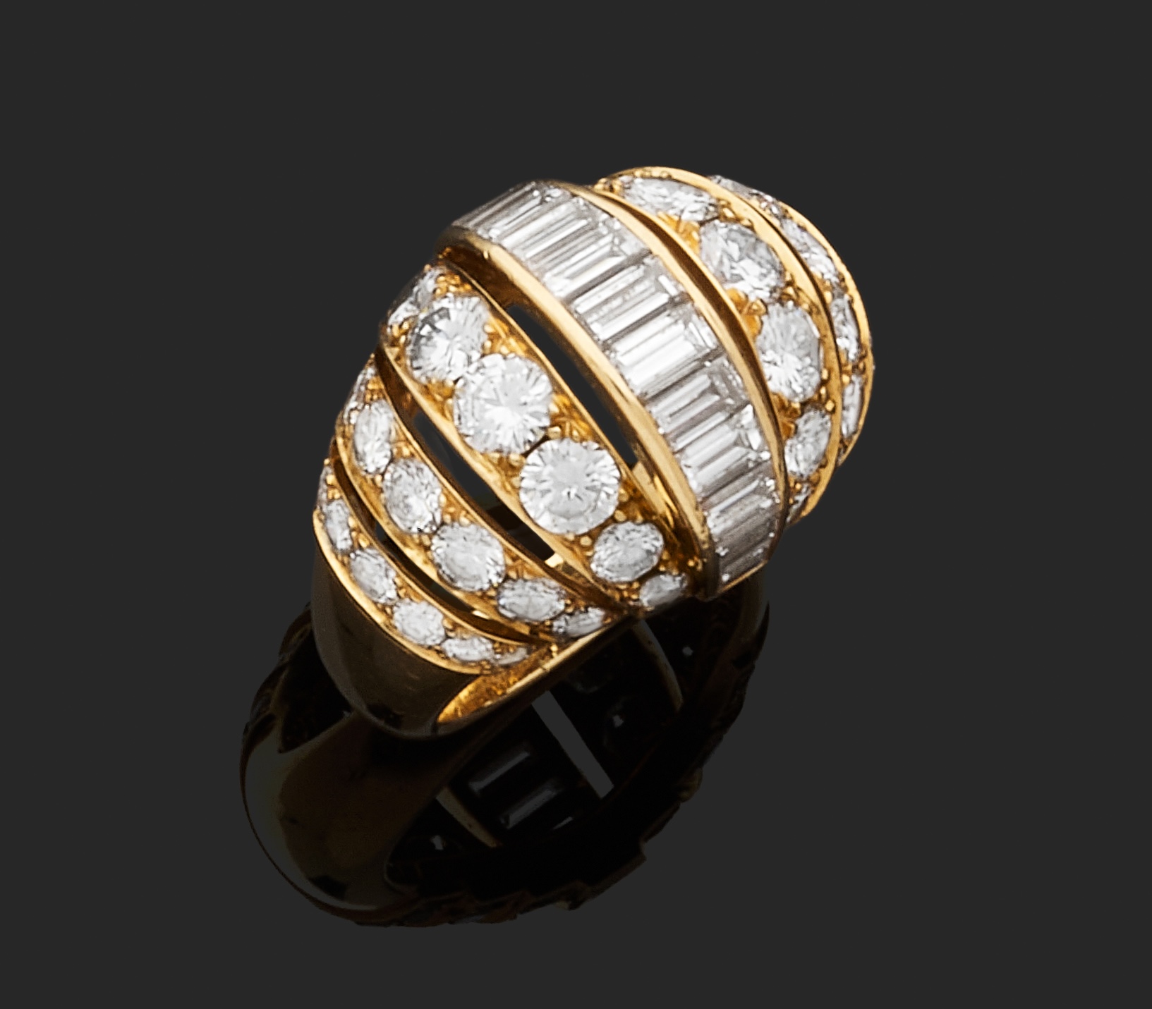 Lot 22 : Bague bombée en or 18K (750‰) ajourée, ornée d’une ligne de diamants baguette épaulée de six lignes de diamants ronds de taille brillant en chute. Signée CARTIER, numérotée 602945. Travail français des années 1980 (traces de mise à taille). Tour de doigt : 53 – Poids brut : 10,2 g
