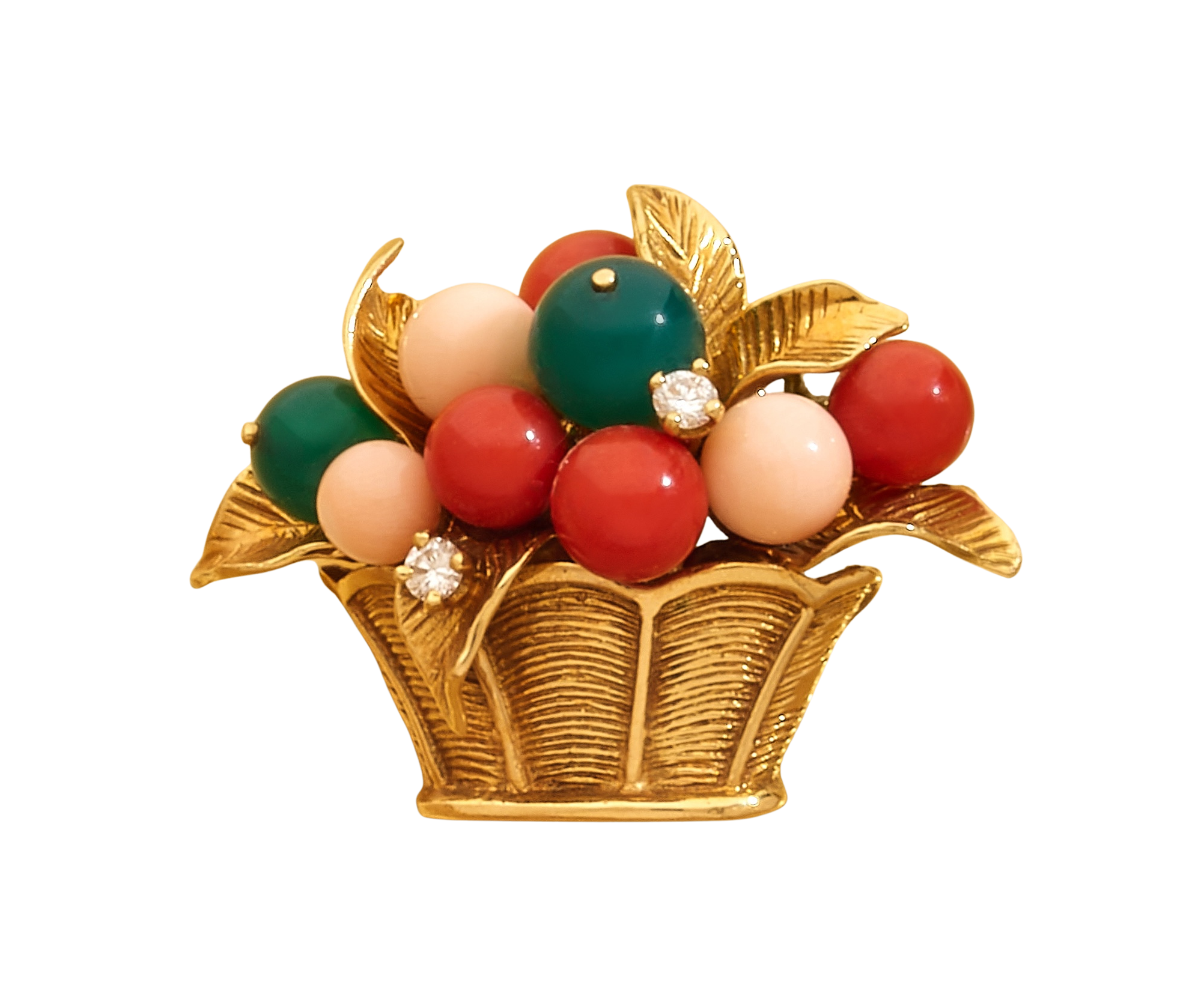 Lot 18 : Broche-clip en or 18K (750‰) représentant un panier de fruits en billes de corail, de chrysoprases, de diamants ronds de taille brillant. Monogrammé VCA, numéroté B1334 I 91. Travail français des années 1990. Dimensions : environ 2,5 x 3,5 cm – Poids brut : 14,6 g Conservé dans un écrin de la Maison BOUCHERON.
